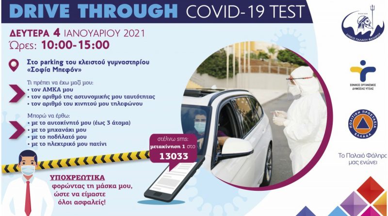 Ο Δήμος Παλαιού Φαλήρου σε συνεργασία με τον ΕΟΔΥ, θα διενεργήσει rapid tests Covid-19 με τη μέθοδο drive through (μέσα από το αυτοκίνητο), τη Δευτέρα 4/1/2021, από τις 10 π.μ έως τις 3 μ.μ. στον Δήμο Παλαιού Φαλήρου και συγκεκριμένα στο πάρκινγκ του Κλειστού Γυμναστηρίου ΣΟΦΙΑ ΜΠΕΦΟΝ.