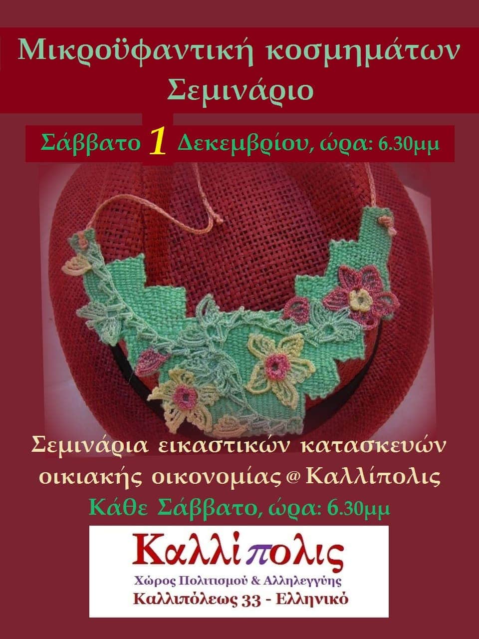 Με μαθήματα δημιουργίας Κοσμημάτων με Μικροϋφαντική συνεχίζονται τα Σεμινάρια στον Χώρο Πολιτισμού & Αλληλεγγύης «Καλλίπολις», το Σάββατο 1 Δεκεμβρίου στις 6.30μμ.