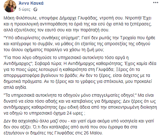 Σκληρή απάντηση έδωσε η Αντιδήμαρχος Καθαριότητας και Ανακύκλωσης του Δήμου Γλυφάδας, Άννυ Καυκά στον υποψήφιο δήμαρχο με τη δημοτική παράταξη «Δυνατή Γλυφάδα», Μάκη Φιλόπουλο, ο οποίος πήρε τα σκήπτρα από τον Κώστα Κόκκορη, αναφορικά με το σχόλιο του τελευταίου για το τροχαίο ατύχημα που είχε η κα Καυκά το βράδυ της Δευτέρας.