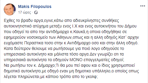 Ο Μάκης Φιλόπουλος με την ανάρτησή του στα μέσα κοινωνικής δικτύωσης όχι μόνο δε σεβάστηκε ότι η Αντιδήμαρχος Γλυφάδας τραυματίστηκε στο τροχαίο και νοσηλεύεται ακόμα στο νοσοκομείο, αλλά προχώρησε και σε ανεπίτρεπτα «fake news», καθώς αναφέρθηκε με υπαινιγμούς στο ότι η κα Καυκά οδηγούσε υπηρεσιακό αυτοκίνητο του Δήμου παρατύπως, παρόλο που ως Αντιδήμαρχος Καθαριότητας έχει ειδική άδεια από την Αποκεντρωμένη Διοίκηση να οδηγεί το υπηρεσιακό όχημα όλο το 24ωρο.