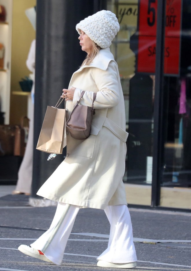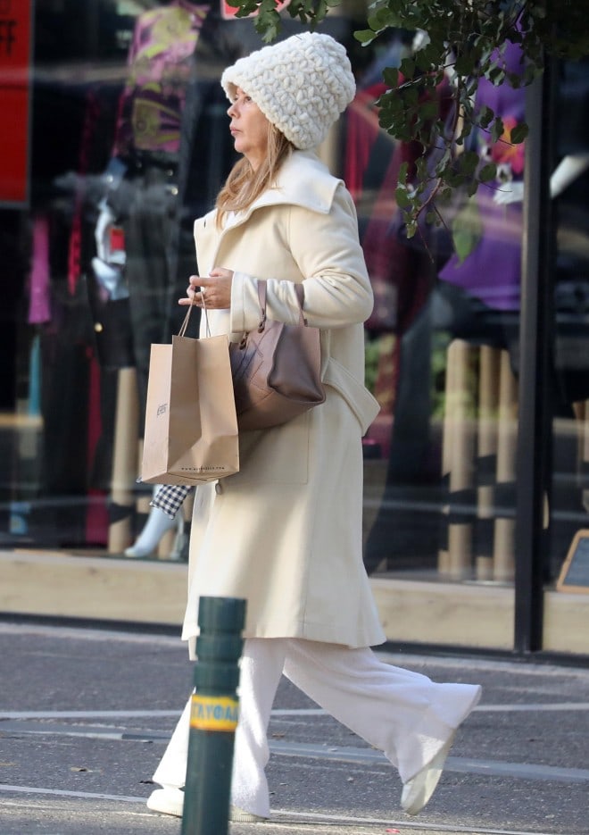 Ο φωτογραφικός φακός εντόπισε την ηθοποιό και παρουσιάστρια στη Γλυφάδα να κάνει τα ψώνια της, φορώντας ένα σετ με λευκό πουλόβερ κι ασορτί φόρμα που συνδύασε με ένα off white παλτό κι ένα τσαντάκι σε nude απόχρωση.