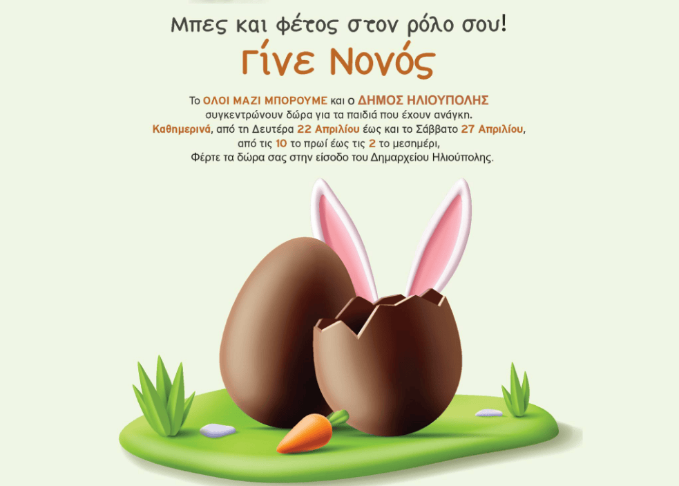 Με σύνθημα «Μπες και φέτος στο ρόλο σου! Γίνε Νονός» το ΟΛΟΙ ΜΑΖΙ ΜΠΟΡΟΥΜΕ και ο Δήμος Ηλιούπολης διοργανώνουν δράση συγκέντρωσης Πασχαλινών δώρων, για τα παιδιά που έχουν ανάγκη στην Ηλιούπολη.