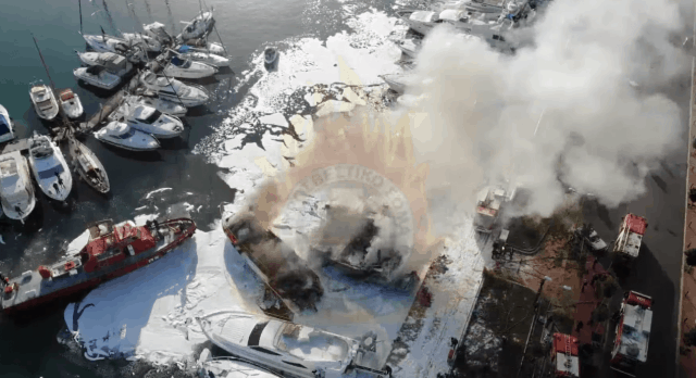 Τα πλάνα είναι από το drone της Πυροσβεστικής και δείχνουν την προσπάθεια για την κατάσβεση της φωτιάς. Οι φλόγες έκαψαν ολοσχερώς δύο σκάφη και προκάλεσαν φθορές στα άλλα δύο.