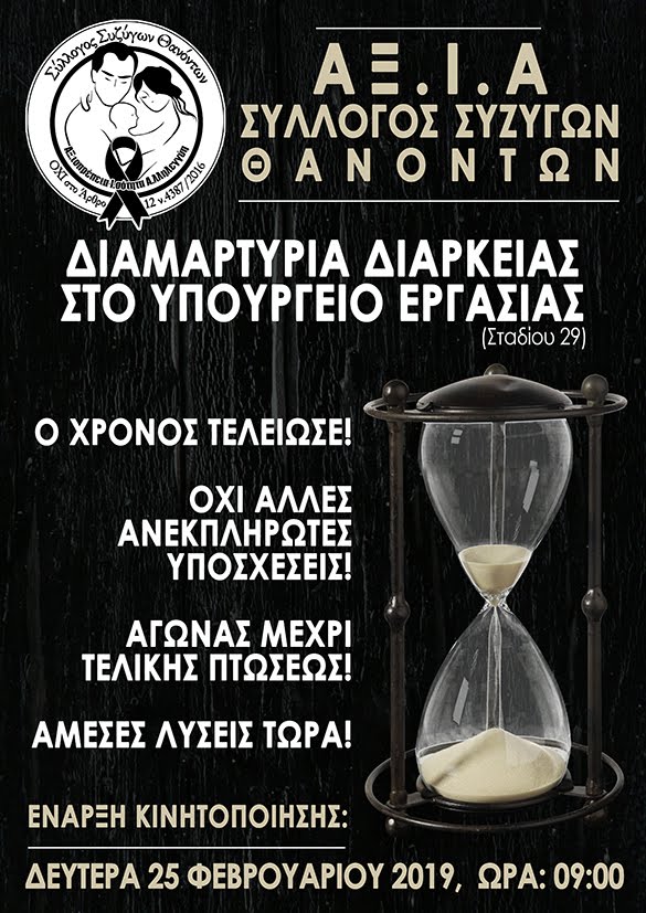 Στην έναρξη της κινητοποίησης διαρκείας που ανακοίνωσε ο Σύλλογος Συζύγων Θανόντων ΑΞ.Ι.Α, Δευτέρα, 25 Φεβρουαρίου 2019, ο Υφυπουργός Κοινωνικών Ασφαλίσεων κ. Πετρόπουλος κάλεσε το ΔΣ του Συλλόγου στο γραφείο του. Δυστυχώς, για ακόμα μια φορά διαπιστώθηκε ότι αθέτησε την υπόσχεση, που ο ίδιος οριοθέτησε για τον Φεβρουάριο του 2019, για κατάθεση νομοθετικής ρύθμισης άρσης των δυσμενών επιπτώσεων του άρθρου 12 του ν.4387/2016, που αφορά στους δικαιούχους Σύνταξης Χηρείας.