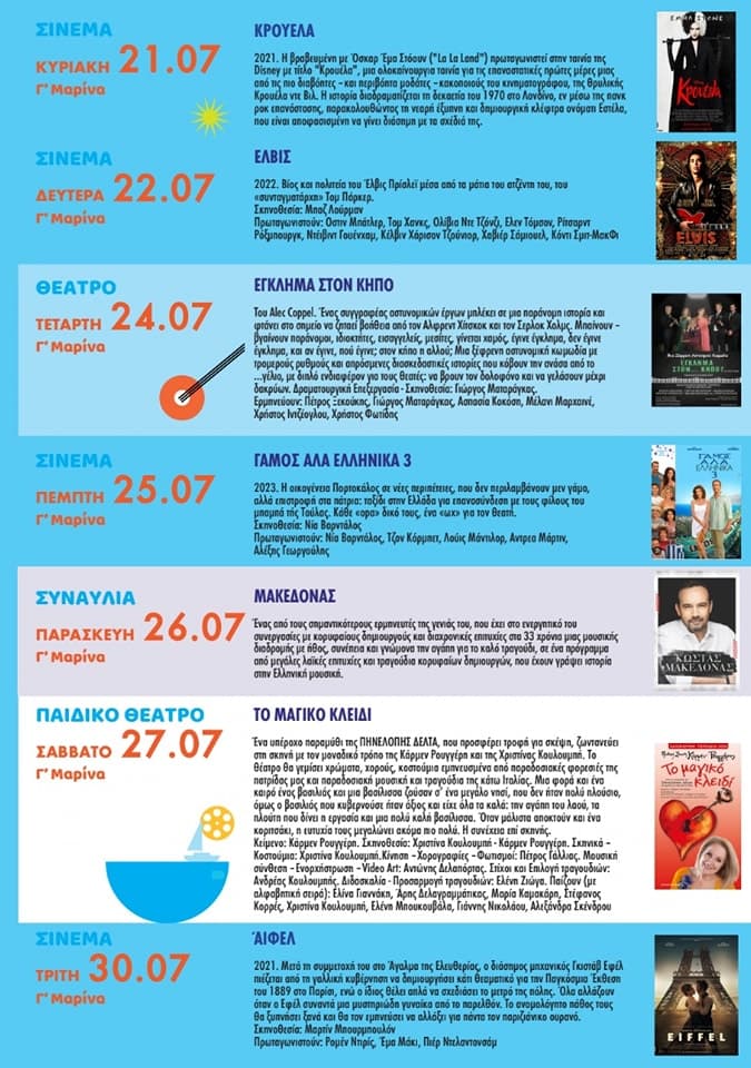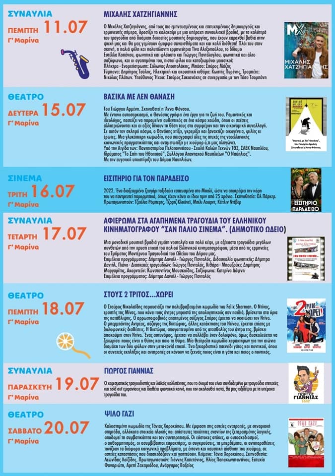 Το Summer Kids Festival για τους μικρούς μας φίλους «τρέχει» με μεγάλη επιτυχία και το Φεστιβάλ Δήμου Γλυφάδας ξεκινά κι αυτό με τη σειρά του: Ο Μιχάλης Χατζηγιάννης μας περιμένει αυτή την Πέμπτη το βράδυ στην 3η Μαρίνα Γλυφάδας και όλος ο Ιούλιος και το πρώτο δεκαήμερο του Αυγούστου έχει αγαπημένη μουσική, υπέροχο θέατρο και σινεμά. Το αναλυτικό πρόγραμμα είναι εδώ και σας καλούμε να το μελετήσετε και να «κυκλώσετε» πολλές ημερομηνίες!