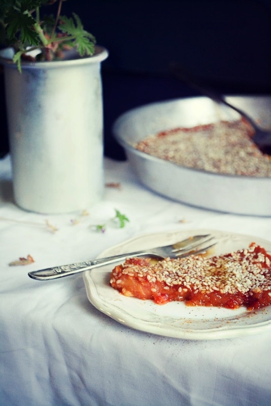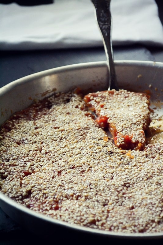 Πασπαλίζουμε με σουσάμι, ραντίζουμε με ελαιόλαδο και φουρνίζουμε. Ψήνουμε στους 180οC στις αντιστάσεις για περίπου 50-60 λεπτά.