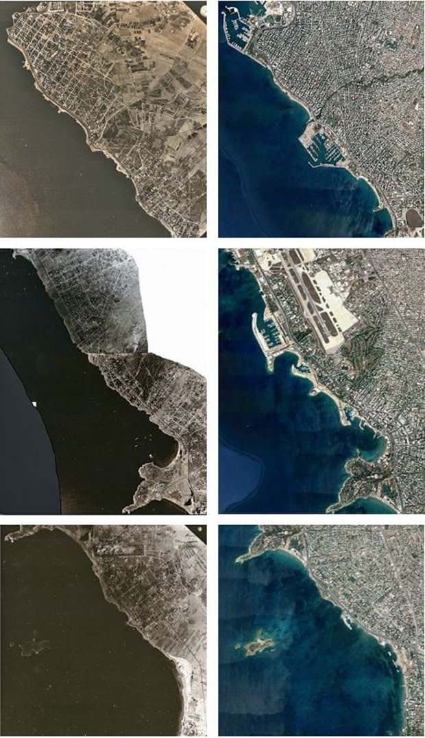Η μορφολογία της παραλίας στα νότια προάστια της πρωτεύουσας, όπως αποτυπώνεται στη σύγκριση αεροφωτογραφιών του 1938 με την εικόνα του 2018. Στο πρώτο ζεύγος φωτογραφιών αποτυπώνεται η περιοχή από Παλαιό Φάληρο μέχρι Άλιμο, στο δεύτερο από Ελληνικό μέχρι Γλυφάδα και στο τρίτο από Βούλα μέχρι Καβούρι.