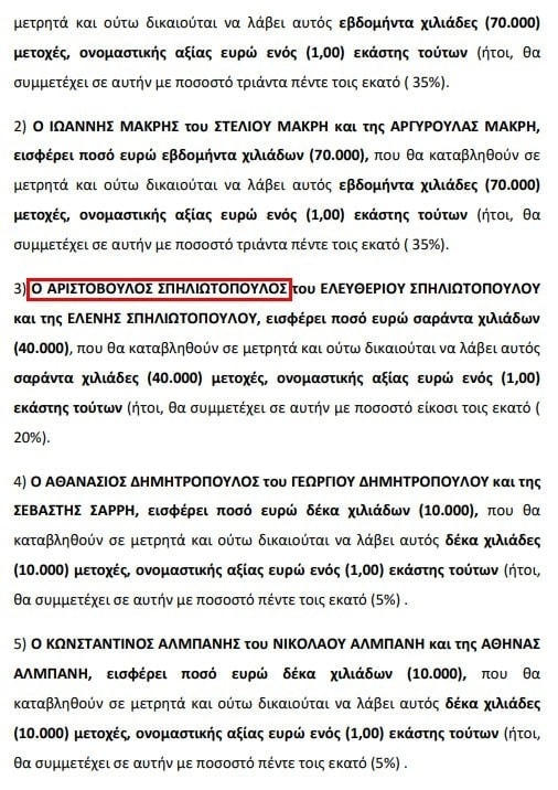 (Απόσπασμα από το μετοχολόγιο στο οποίο αναφέρεται το όνομα του κ. Σπηλιωτόπουλου)Το παρόν μετοχολόγιο της εταιρείας My Services έχει ως εξής: το 40% κατέχει κάποιος Άρης Μπρούμας, επίσης ένα 20% διαθέτει ο επιχειρηματίας Θ. Τ. και το 40% κατείχε ο δολοφονημένος Γιάννης Μακρής.