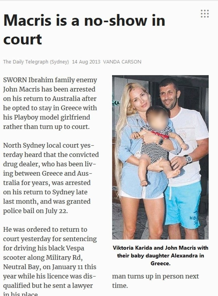 Ο… ορκισμένος εχθρός της οικογένειας Ιμπραήμ, Ι.Μ., συνελήφθη από τις Αρχές όταν αποφάσισε να εγκαταλείψει την Αυστραλία και να μείνει στην Ελλάδα με την ερωμένη του, μοντέλο του Playboy. Το 2013, το τοπικό δικαστήριο του Β. Σύδνεϋ πληροφορήθηκε ότι ο… ζούσε στην Ελλάδα με την έγκυο φίλη του, Β.Κ. Tο ζευγάρι, μάλιστα, ήταν γνωστό στην Ελλάδα, καθώς φωτογραφιζόταν σε ταμπλόιντ περιοδικά κι εφημερίδες. Ο Μ. είναι καταδικασμένος για διακίνηση ναρκωτικών και ήταν επιχειρηματικός εταίρος στο «Kings Cross – John Ibrahim», ένα νυχτερινό κέντρο διασκέδασης της Οξφόρδης. Το 2007 το μαγαζί χρεοκόπησε. Δύο χρόνια αργότερα (2009) κατηγορήθηκε για απόπειρα δολοφονίας του αδελφού του συνεταίρου του. Ο Μ. είναι επίσης κτηματομεσίτης, ο οποίος «μοιράζει» τον χρόνο του ανάμεσα στην Ελλάδα και την Αυστραλία. Επίσης, έχει συλληφθεί από τις Αρχές και για οδικές παραβάσεις και η ποινή του ήταν η εκτέλεση καταναγκαστικών έργων.