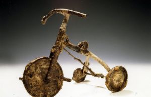 Πίσω από μια προθήκη στο Μουσείο Ειρήνης της Χιροσίμα, στο Πάρκο Ειρήνης που περιβάλει το το Μνημείο Ειρήνης, βρίσκεται ένα κακοποιημένο και σκουριασμένο τρίκυκλο....