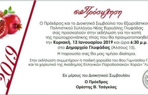 Σας περιμένουμε όλους και όλες στην κοπή της πρωτοχρονιάτικης πίτας του Συλλόγου μας την Κυριακή, 13 Ιανουαρίου 2019 και ώρα 6.30 μ.μ. στο Δημαρχείο...
