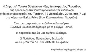 H Δημοτική Τοπική Οργάνωση Νέας Δημοκρατίας Γλυφάδας προσκαλεί το κοινό στη χριστουγεννιάτικη εκδήλωση που διοργανώνει την Τετάρτη, 12 Δεκεμβρίου, στις 7 μ.μ., στο χώρο...