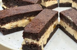 Για το μπράουνι: 200 γρ. βούτυρο ανάλατο, λιωμένο 230 γρ. ζάχαρη κρυσταλλική 150 γρ μαλακή καστανή ζάχαρη 3 μεγάλα αυγά 1 ½ κουταλιά ελαιόλαδο 2 βανίλιες 135 γρ. αλεύρι φαρίνα 90 γρ....