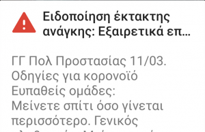 Μαζικά ενημερωτικά μηνύματα για τον κορωνοϊό έστειλε η Γενική Γραμματεία Πολιτικής Προστασίας στα κινητά των πολιτών. Η υπηρεσία 112 ζητά από τους πολίτες και ειδικότερα τις ευπαθείς ομάδες να παραμείνουν στα σπίτια τους και...