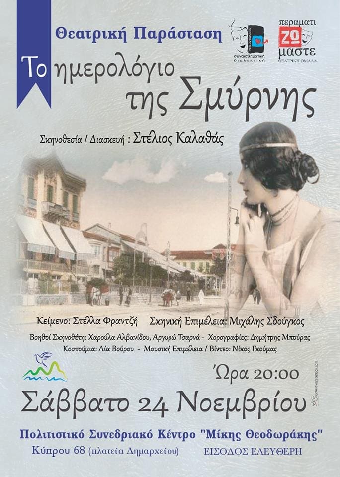 Ο Δήμαρχος, Γιάννης Κωνσταντάτος και η Πολιτιστική Επιτροπή Δήμου Ελληνικού – Αργυρούπολης, σας προσκαλούν στην θεατρική παράσταση «Το ημερολόγιο της Σμύρνης», σε σκηνοθεσία Στέλιου Καλαθά, το Σάββατο 24 Νοεμβρίου 2018 στο Πολιτιστικό Συνεδριακό Κέντρο «Μίκης Θεοδωράκης» Κύπρου 68.