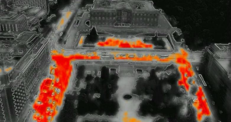 Όπως αναφέρει η Εφημερίδα των Συντακτών, το θερμικό φορτίο στην Πλατεία Συντάγματος και την Πλατεία Ομονοίας καταγράφει η εναέρια λήψη με χρήση θερμικής κάμερας.