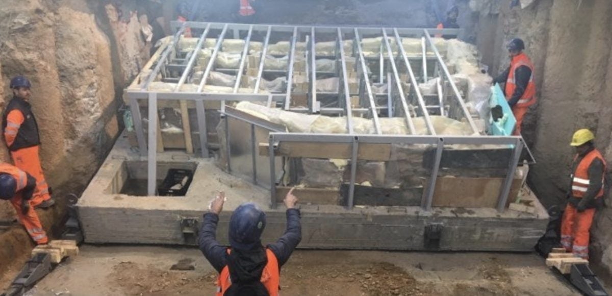 Το ρωμαϊκό λουτρό ξεκίνησε το ταξίδι του για την επιφάνεια της γης το μεσημέρι της Τετάρτης (12/12) και μετά από δέκα ώρες ολίσθησης έφθασε στην επιφάνεια της γης. Με τη βοήθεια δύο γερανών το ρωμαϊκό λουτρό υψώθηκε στον… αέρα και τοποθετήθηκε σε πλατφόρμα νταλίκας για να μεταφερθεί.