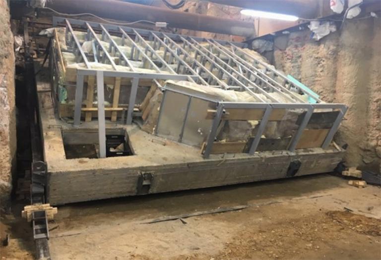 Στηριζόμενο σε έναν ειδικά διαμορφωμένο νάρθηκα από μεταλλικές δοκούς και οπλισμένο σκυρόδεμα, παίρνοντας κλίση 30 μοιρών και κυλώντας για περισσότερο από δέκα ώρες πάνω σε κεκλιμένες μεταλλικές ράγες κατάφερε να βγει την Πέμπτη (13/12) στην επιφάνεια της γης, σύμφωνα με το ρεπορτάζ της εφημερίδας «Έθνος».