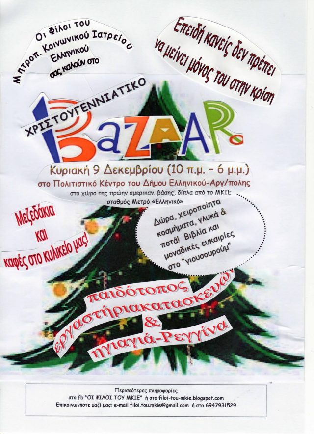 Την Κυριακή 9 Δεκεμβρίου, από τις 10 το πρωί μέχρι τις 6 το απόγευμα, οι “Φίλοι του ΜΚΙΕ”, μια ομάδα πρωτοβουλίας εθελοντών και υποστηρικτών του Μητροπολιτικού Κοινωνικού Ιατρείου Ελληνικού, οργανώνουν το Χριστουγεννιάτικο bazaar τους στο “Πολιτιστικό Κέντρο” (στο χώρο της πρώην αμερικάνικης βάσης – σταθμός “Ελληνικό” του Μετρό), όπως καθιερώθηκε να κάνουν τα τελευταία χρόνια