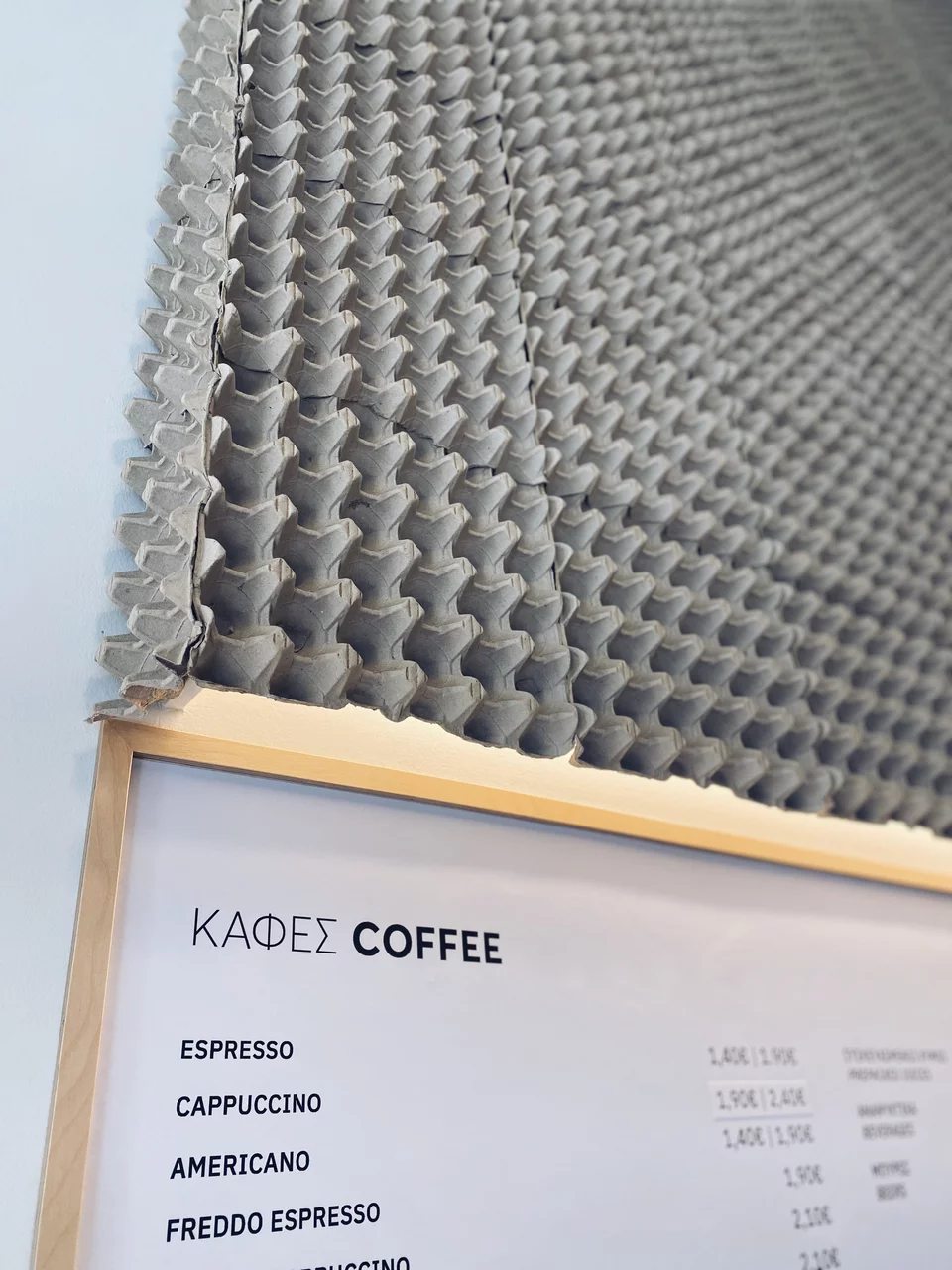 Οι άδειες καρτέλες των αυγών έχουν γίνει μέρος της διακόσμησης του Begg for Egg, ντύνοντας έναν από τους τοίχους / Φωτογραφία: Μάνος Λειβαδάρος/iefimerida.gr