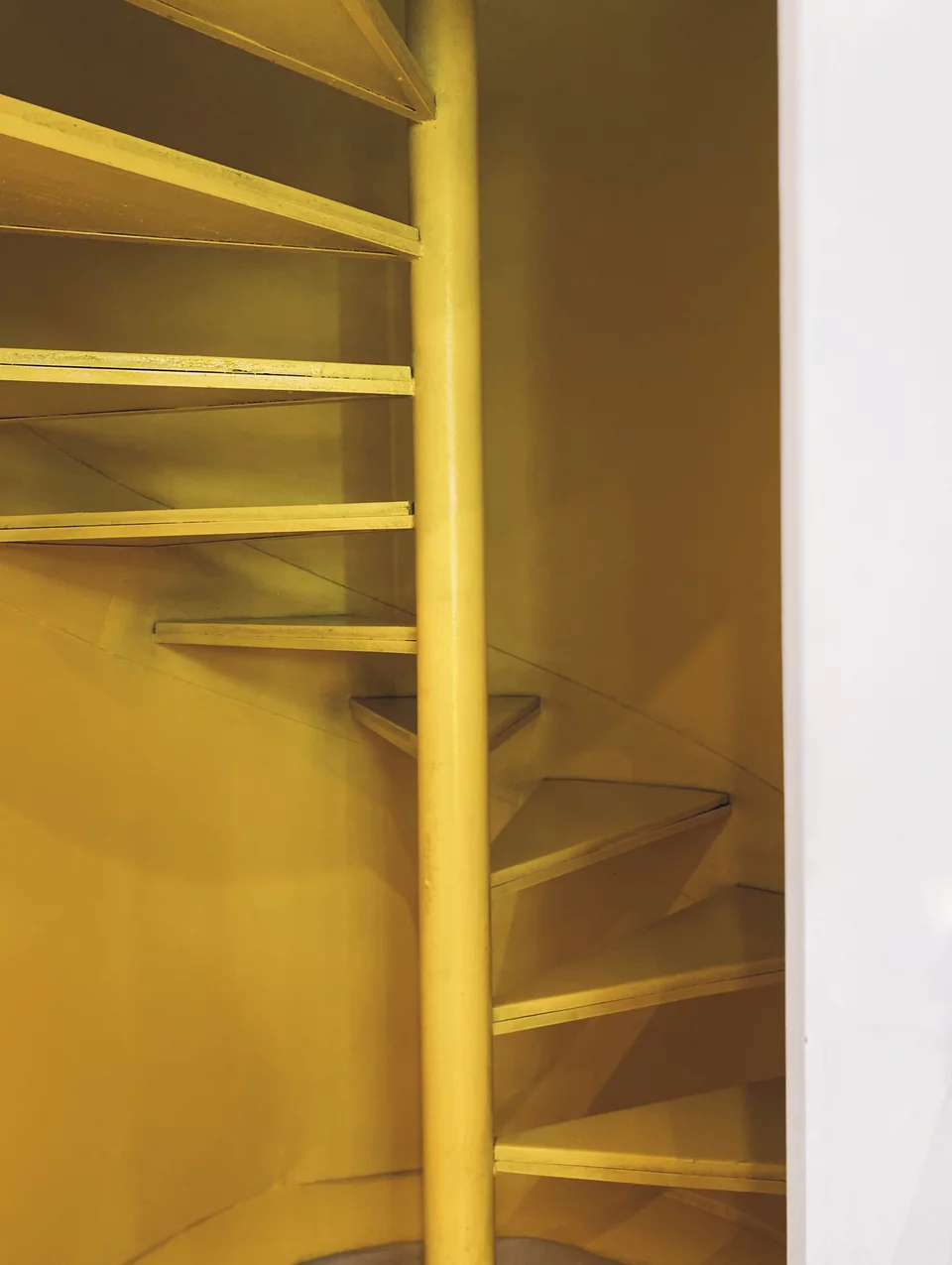Η σκάλα που οδηγεί στο πατάρι του Begg for Egg έχει βαφτεί κίτρινη, παραπέμποντας στον κρόκο του αυγού / Φωτογραφία: Μάνος Λειβαδάρος/iefimerida.gr