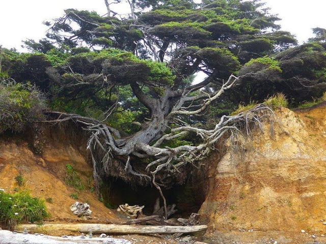 Το δέντρο -ένα έλατο Sitka, ένα μεγάλο δέντρο που συνήθως φτάνει μέχρι και 70 μέτρα ύψος και 2 μέτρα πλάτος όταν ωριμάσει (το μεγαλύτερό γνωστό έλατο του είδους έχει 93 μέτρα ύψος και 5 μέτρα πλάτος)- που βρίσκεται βόρεια του Kalaloch Lodge, κοντά στο κάμπινγκ Kalaloch, στην πολιτεία της Ουάσιγκτον των ΗΠΑ, με την “Tree Root Cave” (Σπηλιά στη Ρίζα του Δέντρου), είναι μοναδικό μιας και συνεχίζει να ζει. ενώ οι ρίζες του βρίσκονται… στο πουθενά. Η διάβρωση, πήρε αυτό που το προμηθεύει με ζωή, το χώμα, αλλά αυτό δεν σταμάτησε να μεγαλώνει στην ακτή.