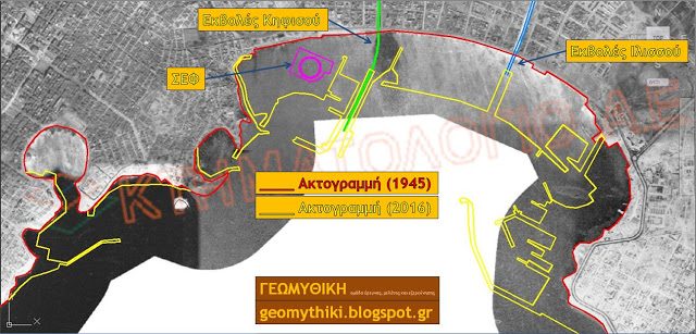 Η θέση της σημερινής ακτογραμμής, των εκβολών των δύο ποταμών (Κηφισός, Ιλισσός) και του ΣΕΦ σε σχέση με την παλιά ακτογραμμή