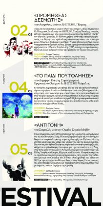 Συγκεκριμένα, οι θεατές θα έχουν την ευκαιρία να παρακολουθήσουν μερικά από τα αριστουργήματα της ελληνικής και παγκόσμιας δραματουργίας, από τους κορυφαίους εκπρόσωπους της εγχώριας θεατρικής «σκηνής» ενώ ειδικά για τα παιδιά, το Φεστιβάλ φιλοξενεί την παράσταση «Το παιδί που τόλμησε», σε σκηνοθεσία Δημήτρη Πιέτρη.