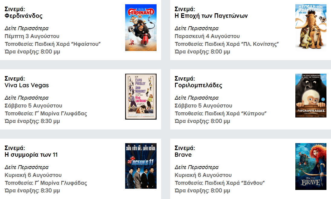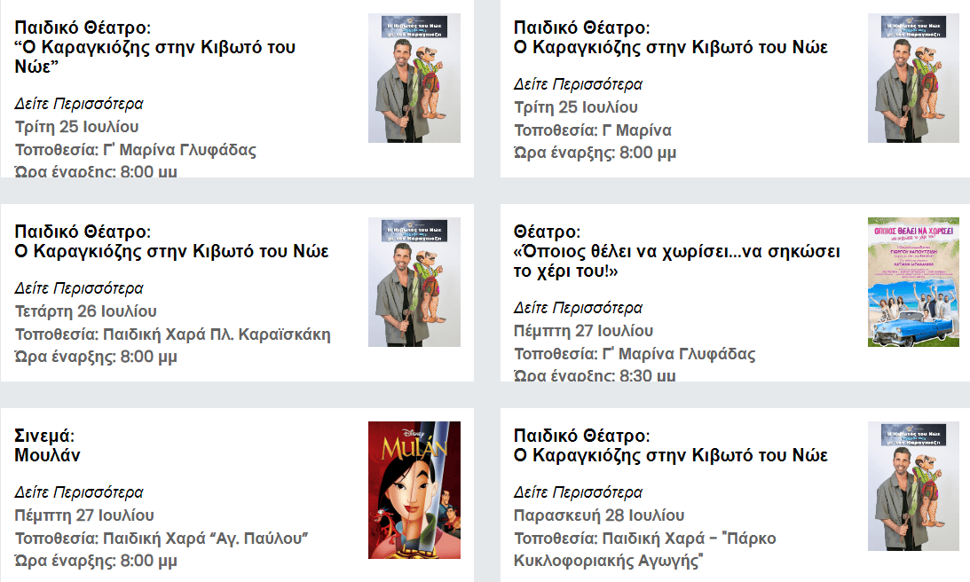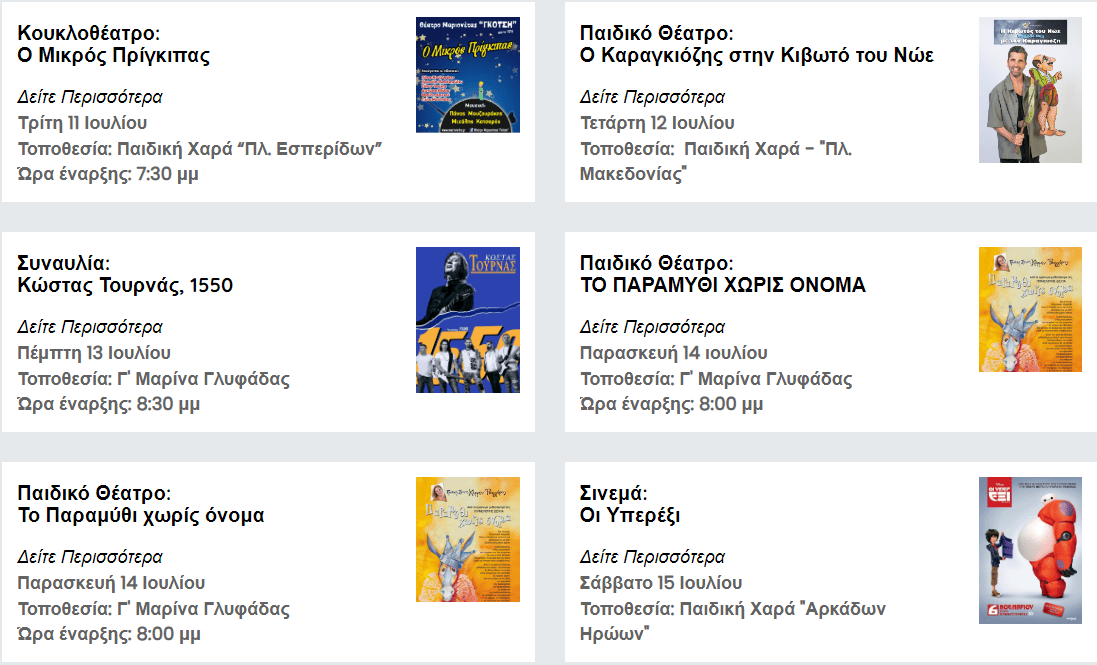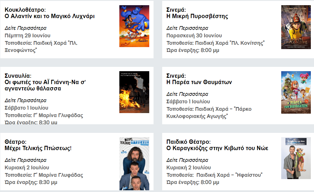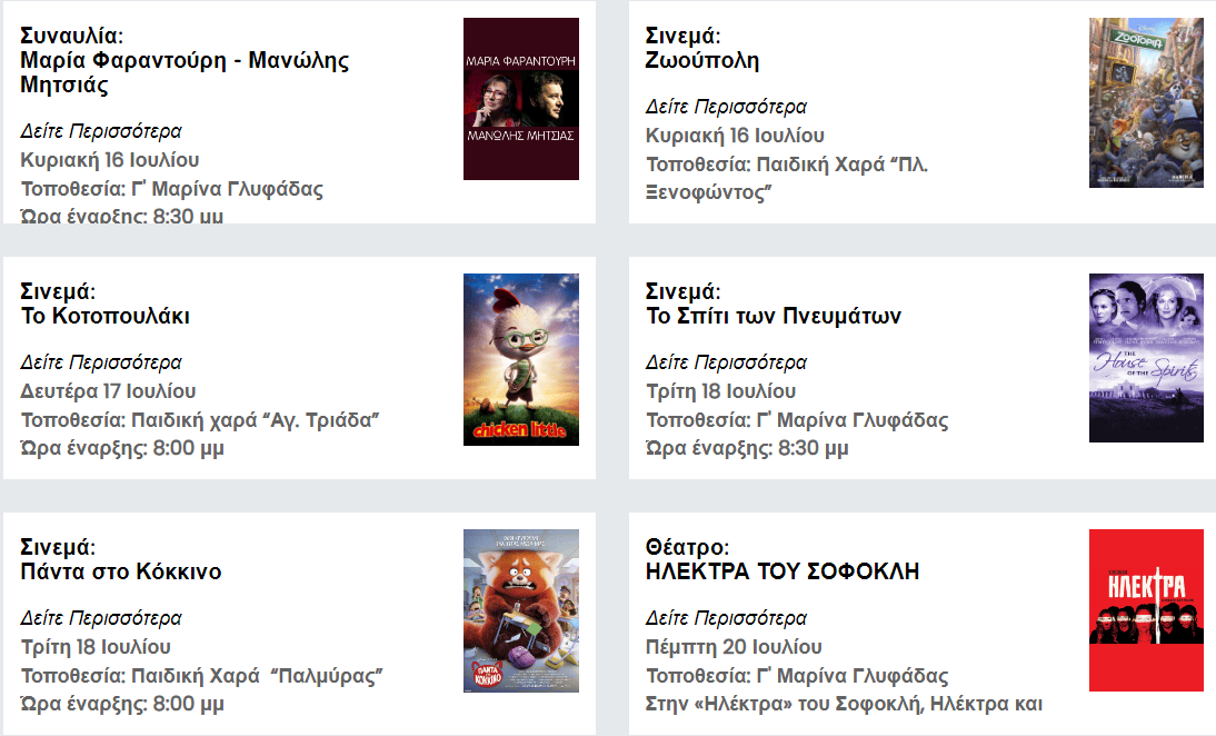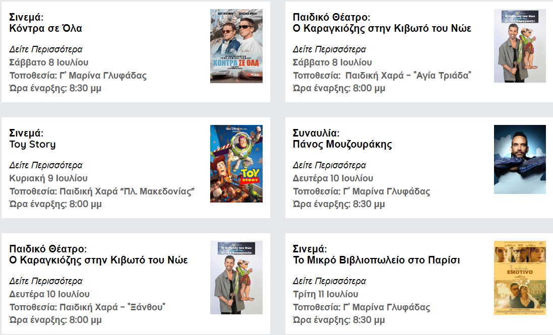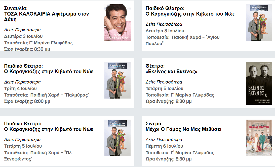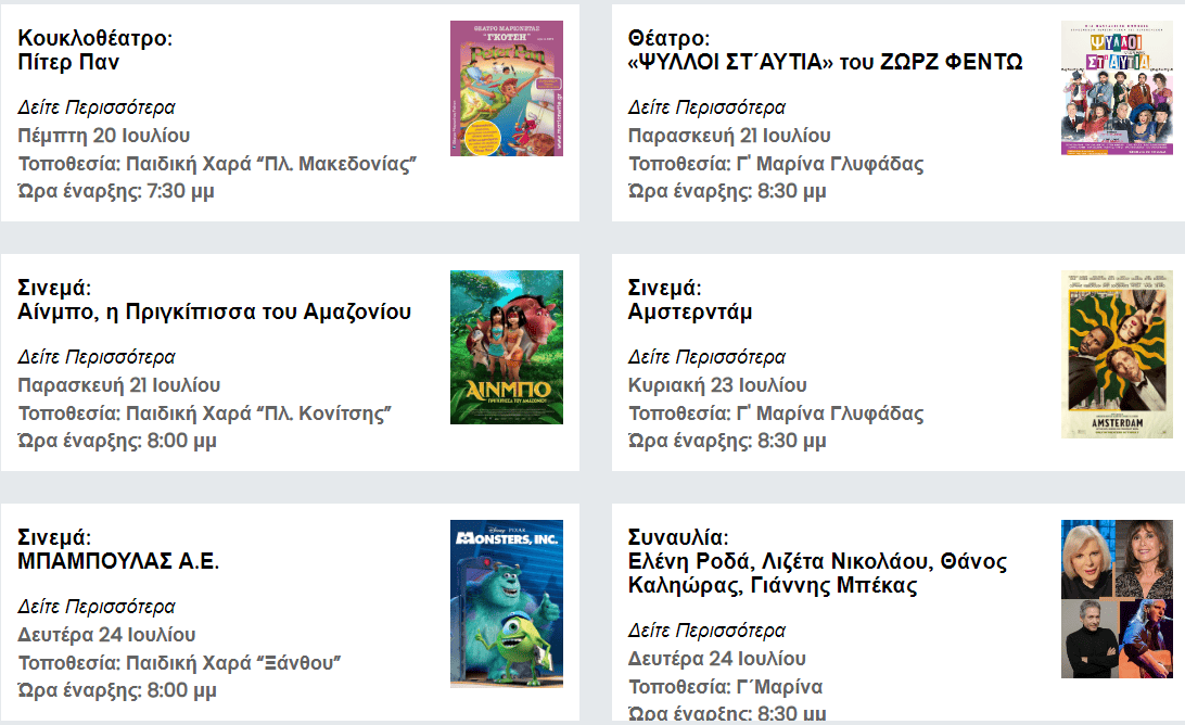 Φέτος τρέχει παράλληλα και πρόγραμμα για παιδιά και το πρόγραμμα για μικρούς και μεγάλους: Στο ανοιχτό μας θέατρο στην 3η Μαρίνα Γλυφάδας όλες οι συναυλίες, οι ταινίες και τα θεατρικά και σε παιδικές χαρές και άλλα σημεία της πόλης μας όλες οι παιδικές παραστάσεις!
