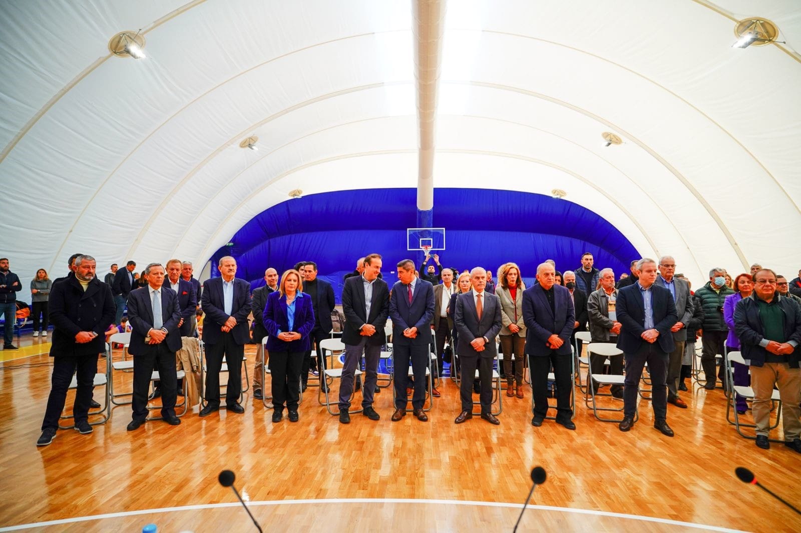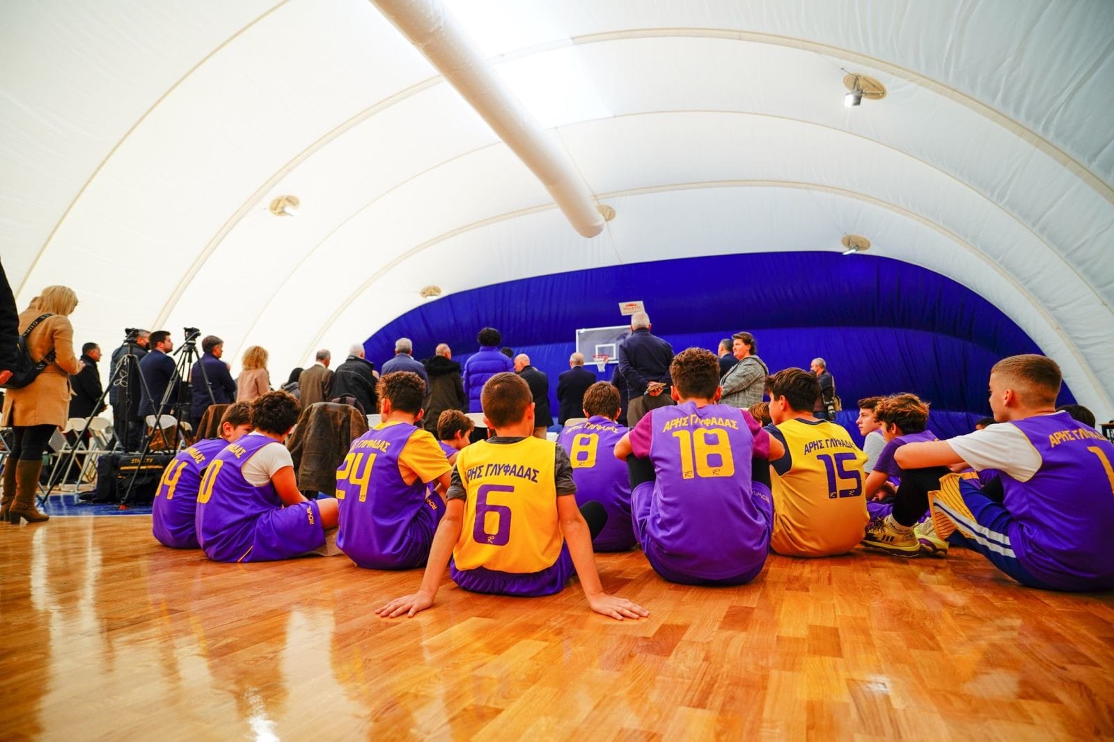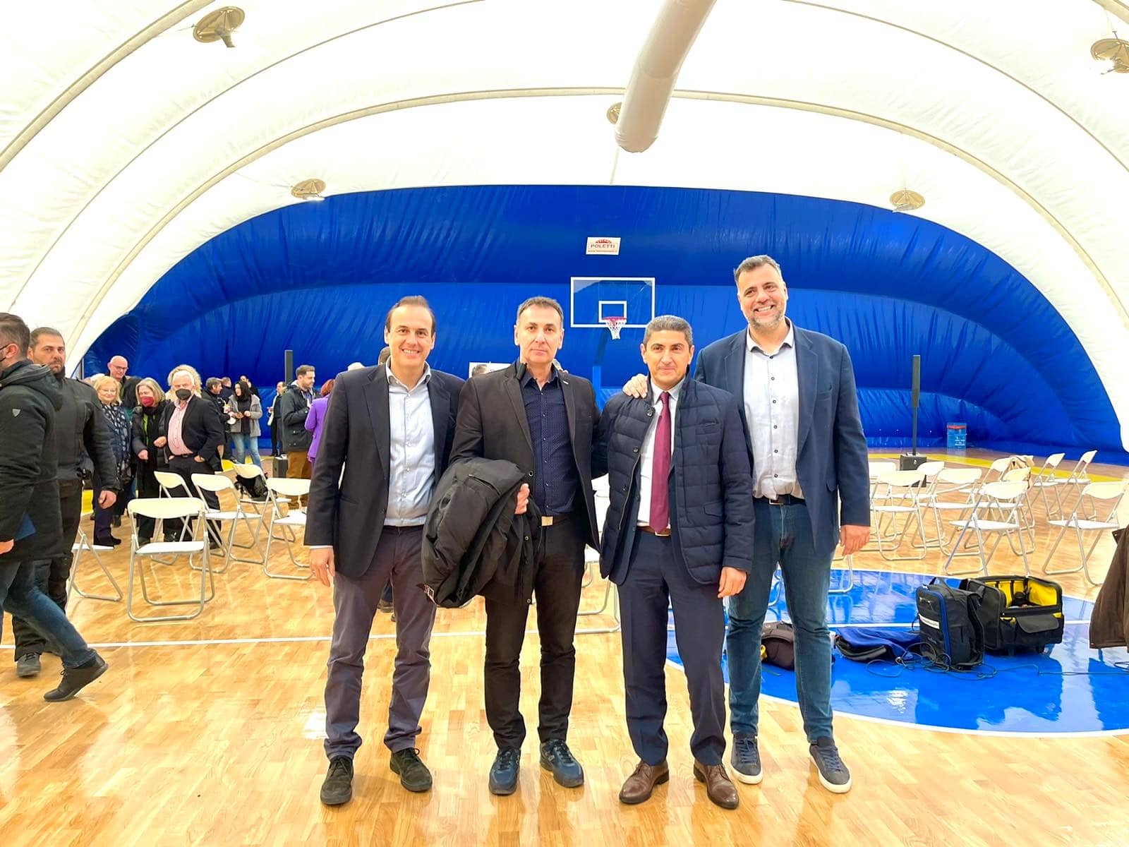 Ο Δήμαρχος Γιώργος Παπανικολάου μαζί με τον Υφυπουργό Πολιτισμού και Αθλητισμού Λευτέρη Αυγενάκη και τον Υφυπουργό Χωροταξίας και Αστικού Περιβάλλοντος Νίκο Ταγαρά εγκαινίασαν το κλειστό γυμναστήριο μπάσκετ με αεροϋποστηριζόμενο θόλο («μπαλόνι») στην περιοχή κάτω από το Γκολφ.