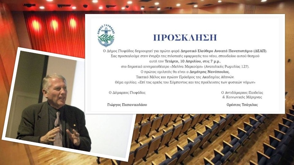 Για πρώτη φορά ο Δήμος Γλυφάδας, με την πιλοτική εφαρμογή του νέου δημοτικού ελεύθερου ανοιχτού Πανεπιστημίου ξεκινά αυτό το θεσμό αυτή την Τετάρτη, 10 Απριλίου, στις 7 μ.μ., στο δημοτικό κινηματοθέατρο «Μελίνα Μερκούρη».