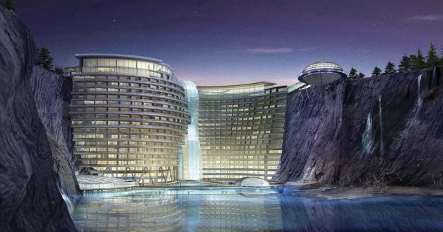 Στην πόλη Σονγκτζιάνγκ, σύμφωνα με το ΑΠΕ, 35 χιλιόμετρα νοτιοδυτικά της Σαγκάης, οικοδομήθηκε σε διάστημα μιας δεκαετίας σε ένα εγκαταλελειμμένο λατομείο, βάθους 88 μέτρων. Εγκαίνια έγιναν αυτόν τον μήνα. Διαθέτει 337 δωμάτια, σε 18 ορόφους, οι 16 εκ των οποίων είναι κάτω από την επιφάνεια του εδάφους και οι δύο μέσα στο νερό. Όλα τα δωμάτια – εκτός από τα «υποβρύχια» – έχουν από το μπαλκόνι τους θέα των καταρρακτών που βουτάνε κάτω στα τοιχώματα του λατομείου, αλλά και του υάλινου «καταρράκτη» που έχει χτιστεί στο κέντρο του ξενοδοχείου πολυτελείας.