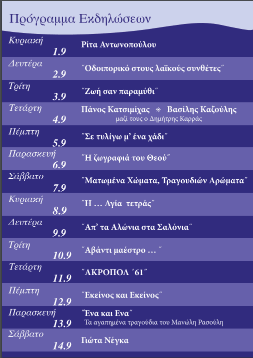 Το πρόγραμμα ξεκινά την 1η Σεπτεμβρίου με μία συναυλία της Ρίας Αντωνοπούλου και ολοκληρώνεται το Σάββατο 14 Σεπτεμβρίου με συναυλία της Γιώτας Νέγκα.