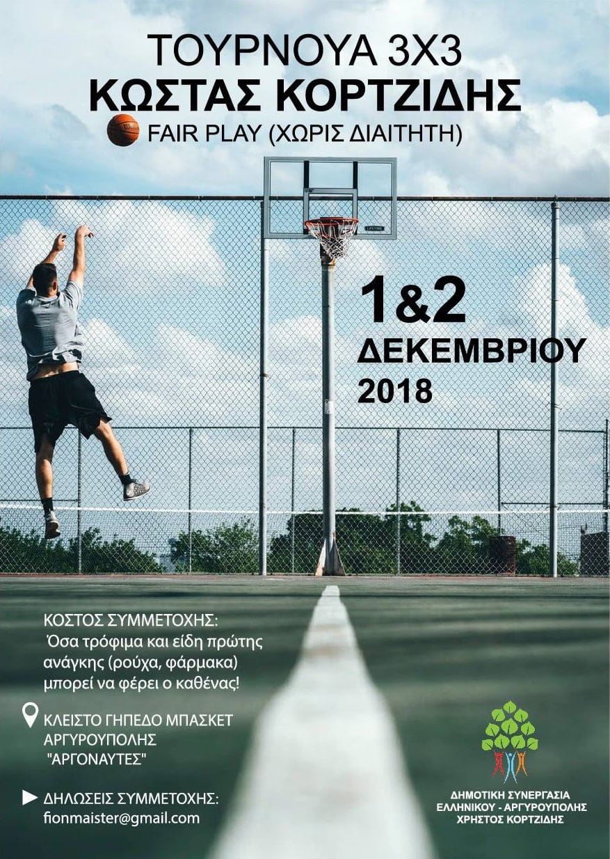Στη μνήμη του η παράταξή μας διοργανώνει τουρνουά μπάσκετ 3Χ3 που θα διεξαχθεί στο Κλειστό Γυμναστήριο Καλαθοσφαίρισης Α.Π.Χ. ΑΡΓΟΝΑΥΤΕΣ (Τριπόλεως 5 Αργυρούπολη) το Σάββατο και την Κυριακή 1 και 2 Δεκεμβρίου από 10:00 έως 15:00.