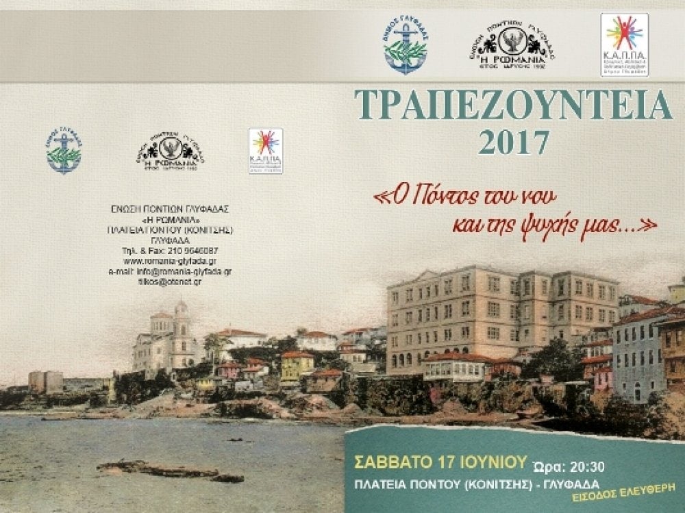 Έφτασε η ώρα για την κορυφαία πολιτιστική εκδήλωση της Ένωσης Ποντίων Γλυφάδας «Η Ρωμανία». Τα «Τραπεζούντεια 2017», πραγματοποιηθούν το Σάββατο 17 Ιουνίου 2017 και ώρα 20:30 στην Πλατεία Πόντου (πρώην Κονίτσης) Αγία Τριάδα, Γλυφάδα.