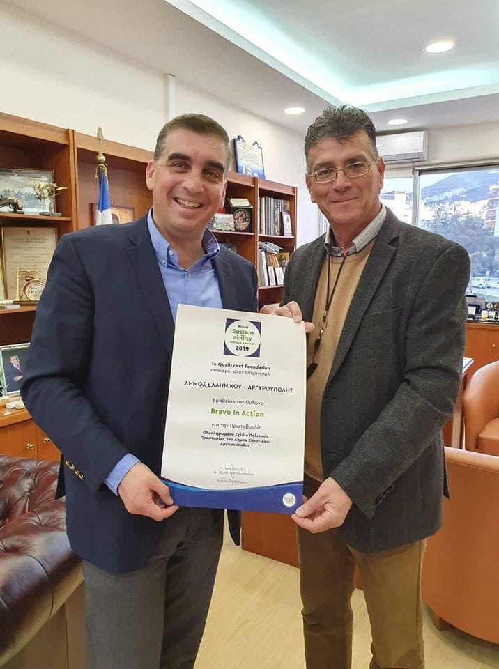 Ο Δήμος Ελληνικού Αργυρούπολης βραβεύτηκε στο πλαίσιο του ετήσιου θεσμού BRAVO Sustain and Ability, Dialogue & Awards 2019, για την πολυεπίπεδη προσπάθειά του, όσο αφορά στην οργάνωση και εκτέλεση σχεδίων Πολιτικής Προστασίας και μέτρων πρόληψης για την προστασία του Φυσικού Περιβάλλοντος.
