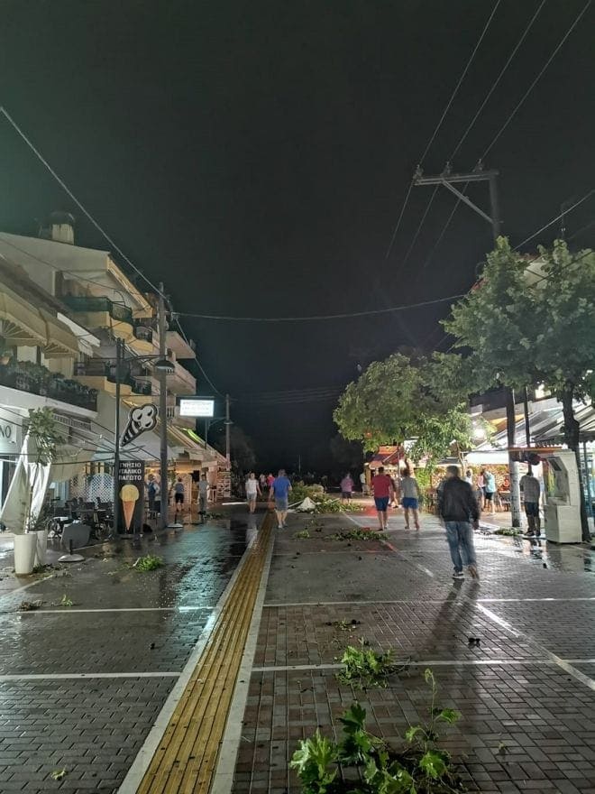 Στη Χαλκιδική κυριαρχούν εικόνες απόλυτης καταστροφής με κομμένες κολώνες της ΔΕΗ, αμάξια στη θάλασσα, κομμένα δέντρα στη μέση του δρόμου, αναποδογυρισμένα οχήματα, γκρεμισμένα μπαλκόνια και οροφές σπιτιών.