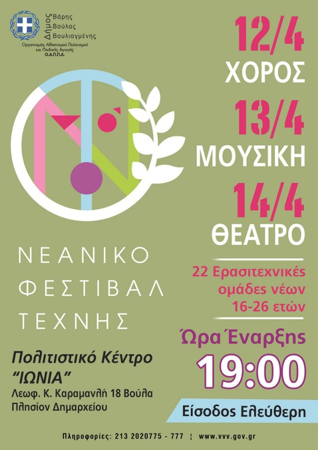 Ένα τριήμερο αφιερωμένο στον χορό, τη μουσική και το θέατρο έχει διοργανώσει ο Δήμος Βάρης Βούλας Βουλιαγμένης και ο ΟΑΠΠΑ με τη συμμετοχή 22 νεανικών ερασιτεχνικών σχημάτων της πόλης. Το φεστιβάλ θα πραγματοποιηθεί από την Παρασκευή 12 Απριλίου μέχρι την Κυριακή 14 Απριλίου στην αίθουσα «Ιωνία» Λεωφ. Κ. Καραμανλή 18, Βούλα και οι παραστάσεις ξεκινάνε κάθε μέρα στις 19.00.