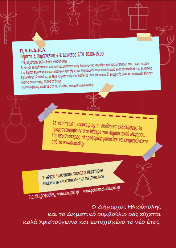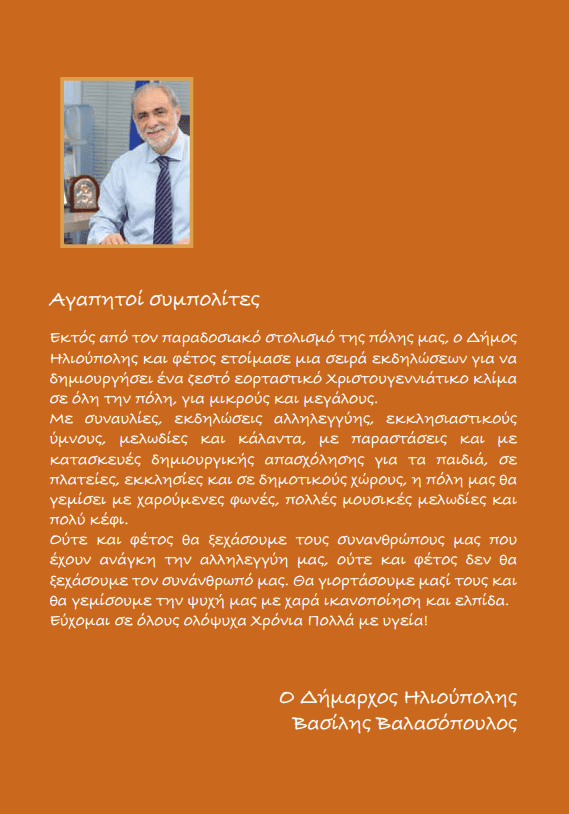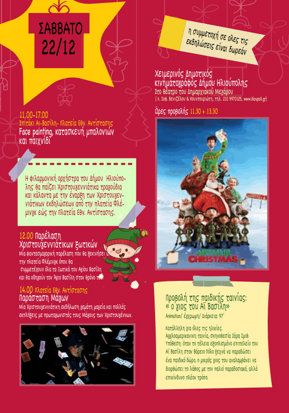 Εκτός από τον παραδοσιακό στολισμό της πόλης μας, ο Δήμος Ηλιούπολης και φέτος ετοίμασε μια σειρά εκδηλώσεων για να δημιουργήσει ένα ζεστό εορταστικό Χριστουγεννιάτικο κλίμα σε όλη την πόλη, για μικρούς και μεγάλους.