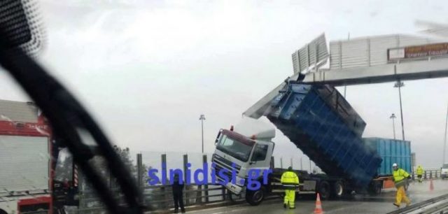 Σύμφωνα με την εφημερίδα «Συνείδηση», οι ισχυροί άνεμοι σήκωσαν την καρότσα της μεγάλης νταλίκας και την «κάρφωσαν» στις πινακίδες σήμανσης της γέφυρας!