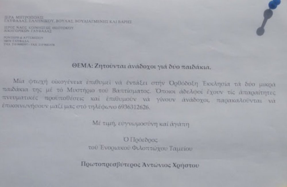 Με ανακοίνωσή της, η Ιερά Μητρόπολη Γλυφάδας απευθύνει έκκληση προς τους πιστούς να βοηθήσουν ώστε δύο παιδιά μιας φτωχής οικογένειας να ενταχθούν στην Ορθόδοξη εκκλησία με το Μυστήριο του Βαπτίσματος. Όπως τονίζεται: Όποιοι αδελφοί έχουν τις απαραίτητες πνευματικές προϋποθέσεις και επιθυμούν να γίνουν ανάδοχοι παρακαλούνται να επικοινωνήσουν στο τηλέφωνο 6936312626».